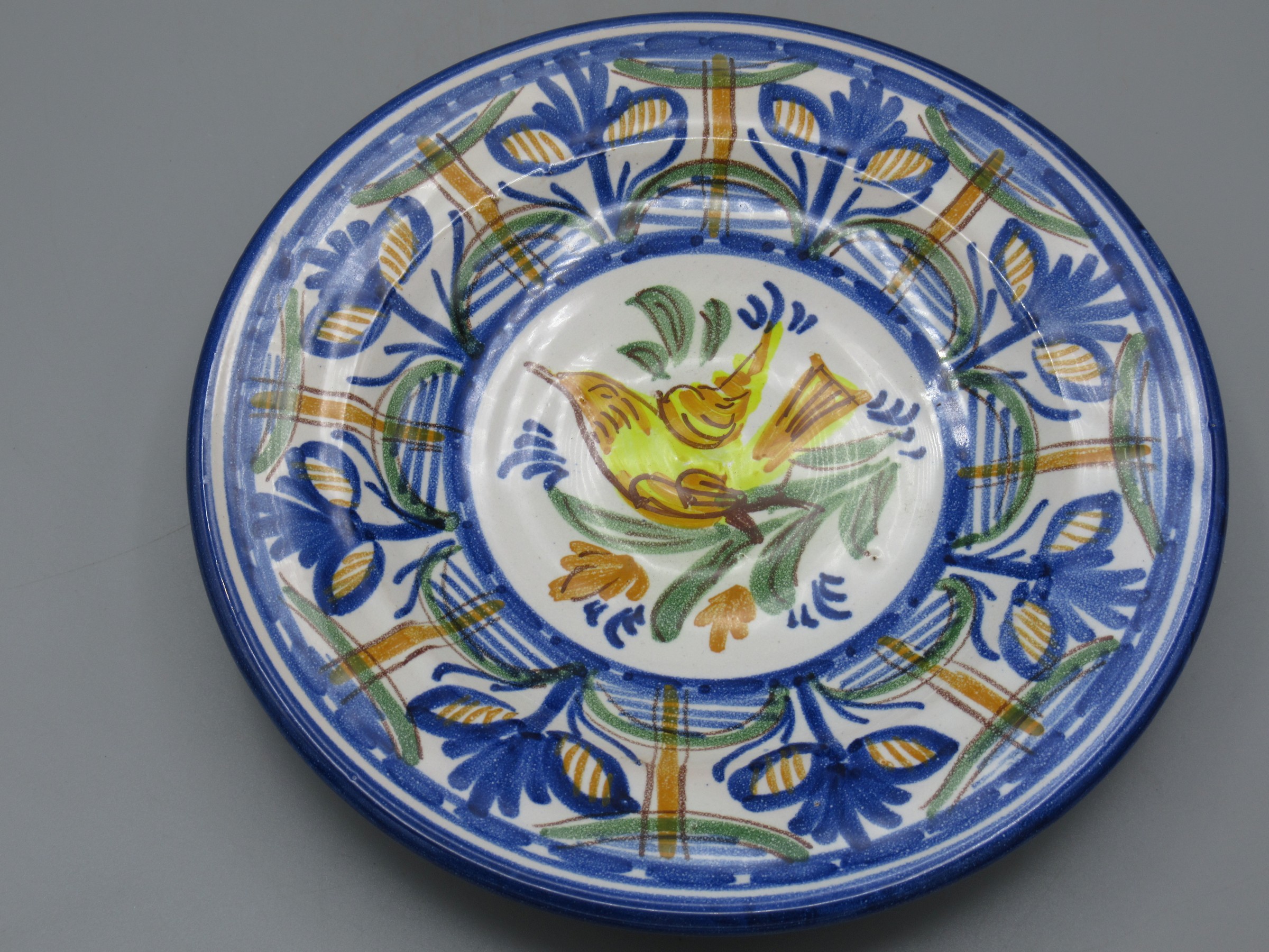 Assiette décorative oiseau jaune et motifs bleus